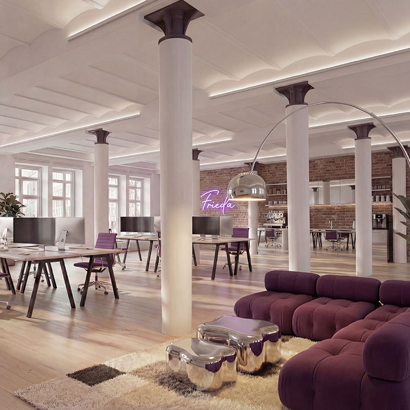 So sieht ein Büro aus, das Menschen gerne betreten. Klare Linien, moderne Materialien und ein harmonisches Lichtkonzept schaffen einen Ort, an dem Ideen wachsen können.