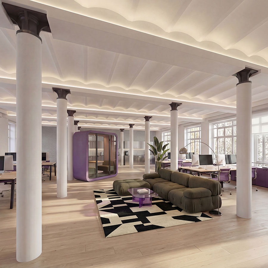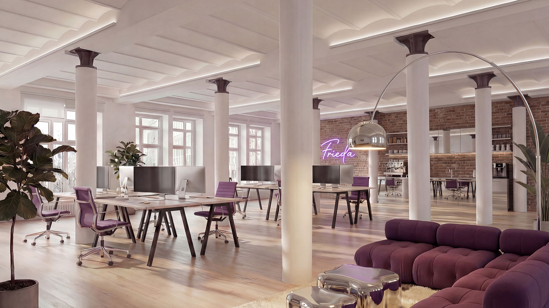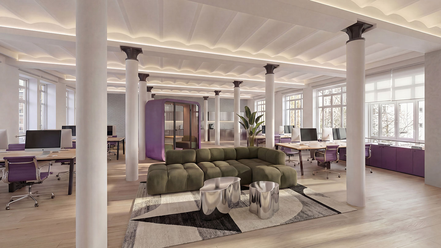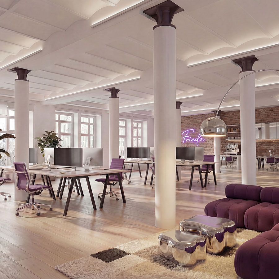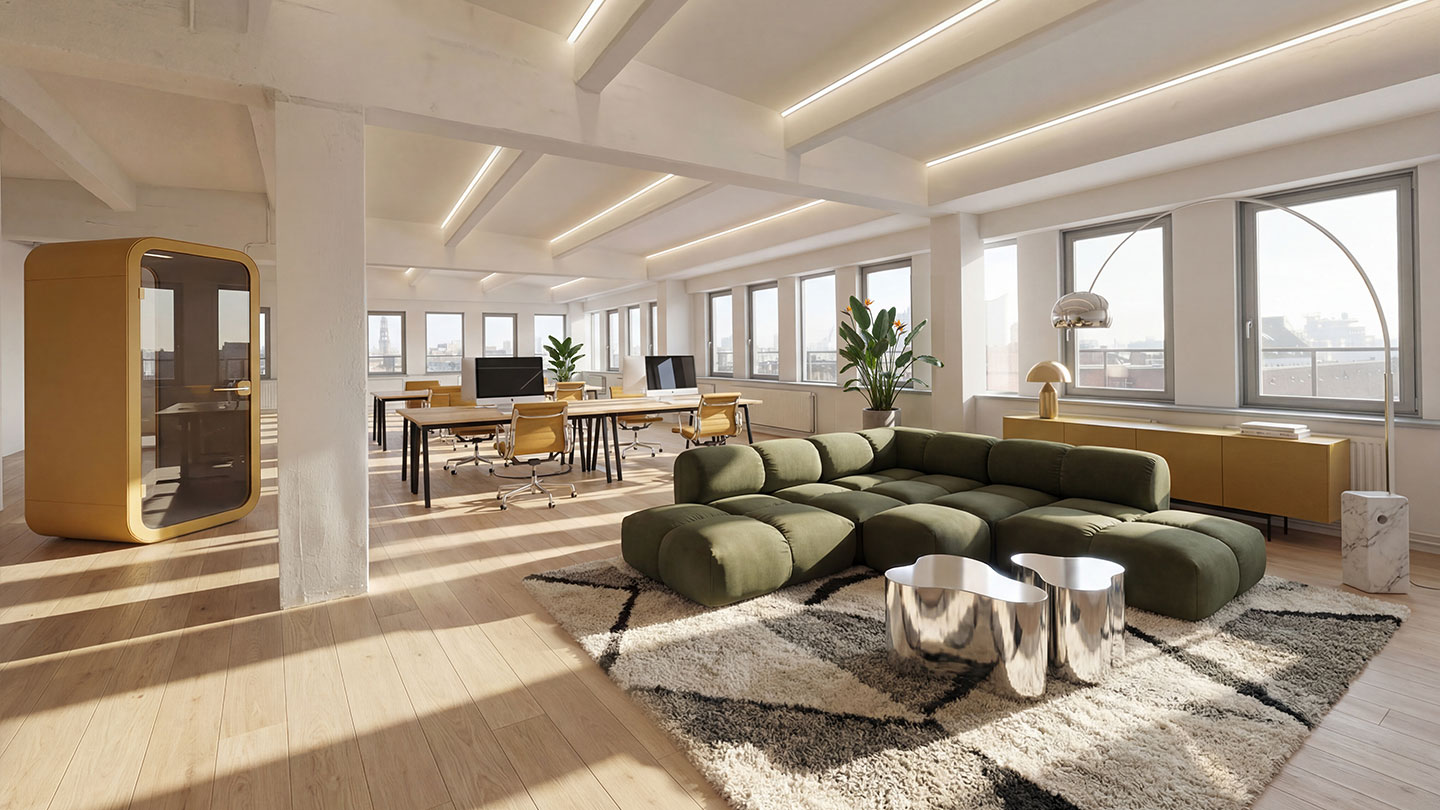 So sieht ein Büro aus, das Menschen gerne betreten. Klare Linien, moderne Materialien und ein harmonisches Lichtkonzept schaffen einen Ort, an dem Ideen wachsen können.