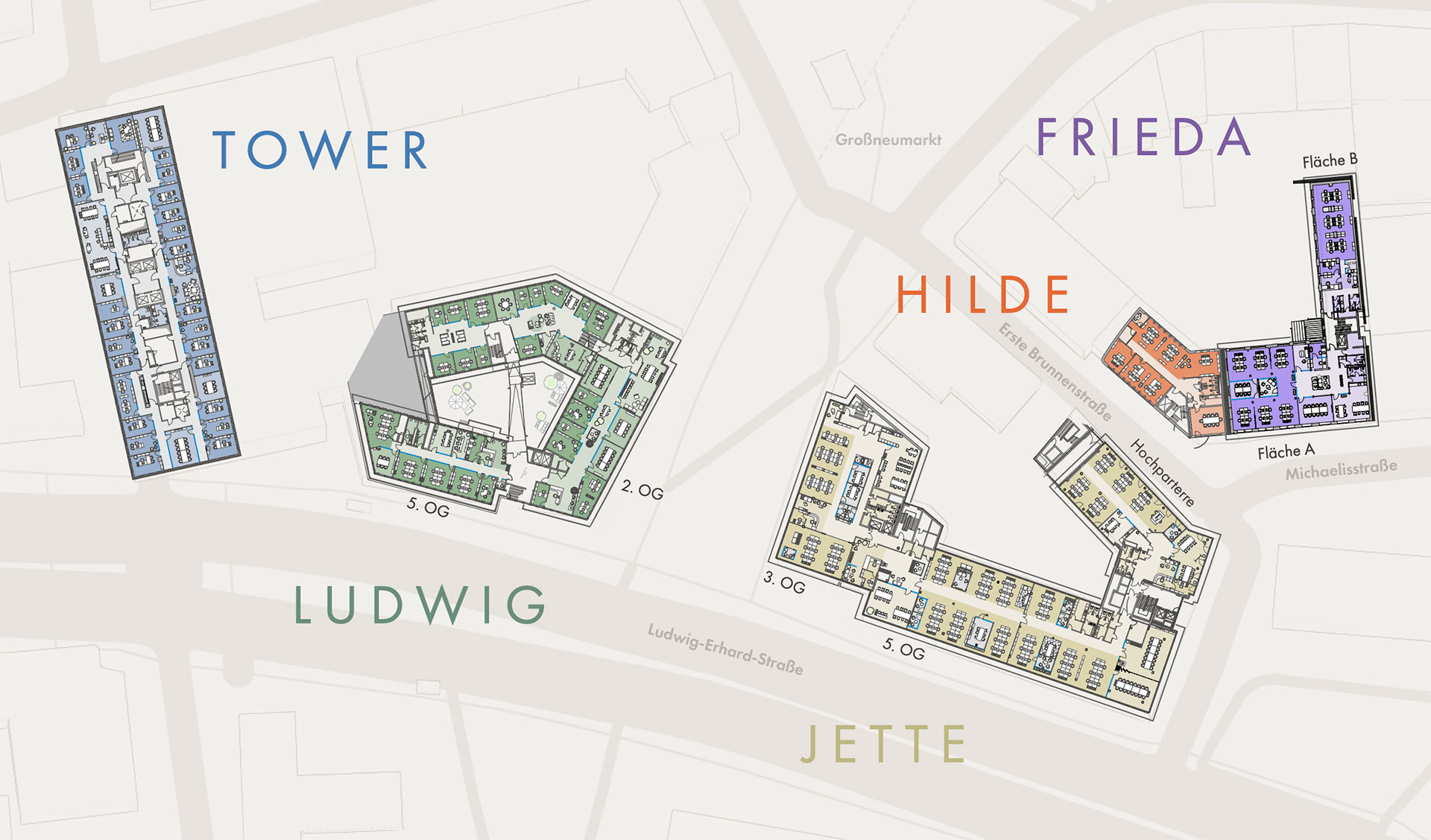 Als Mieter profitieren Sie von der Vielseitigkeit des Quartiers: Von Loft bis High-End, von Boutiquebüro bis Großraum, vom Erdgeschoss bis zum Tower.